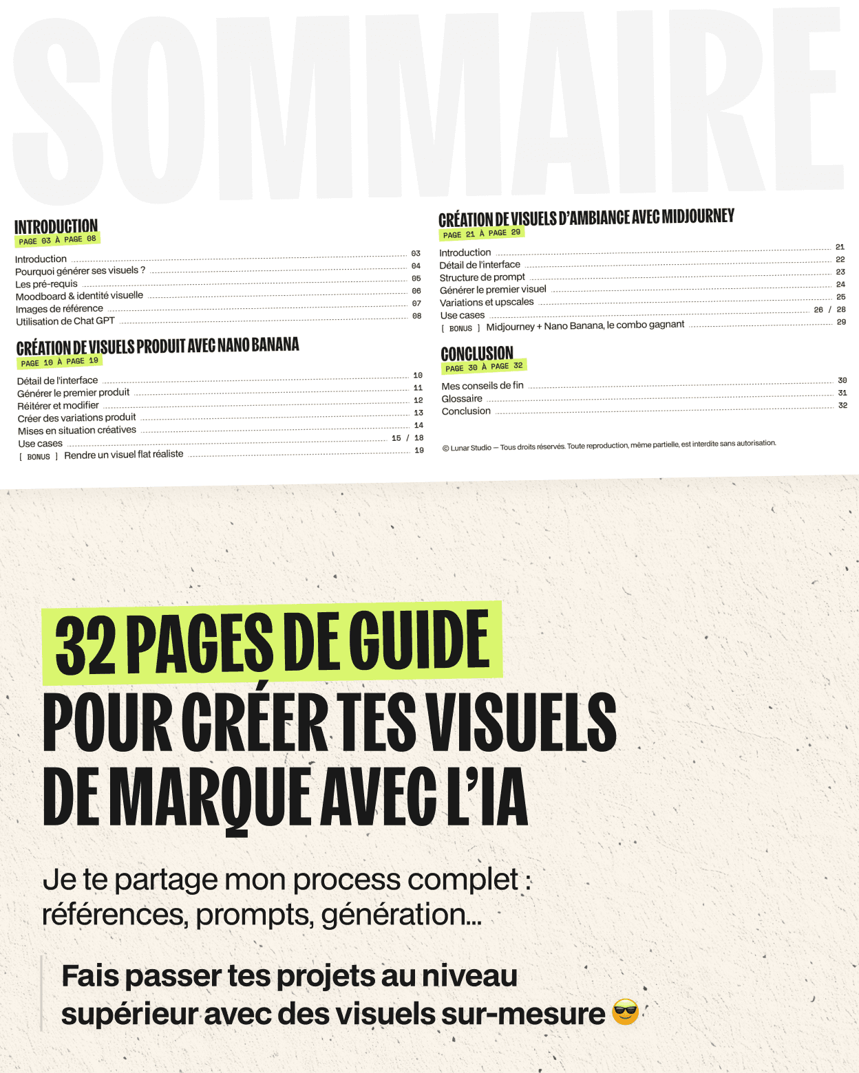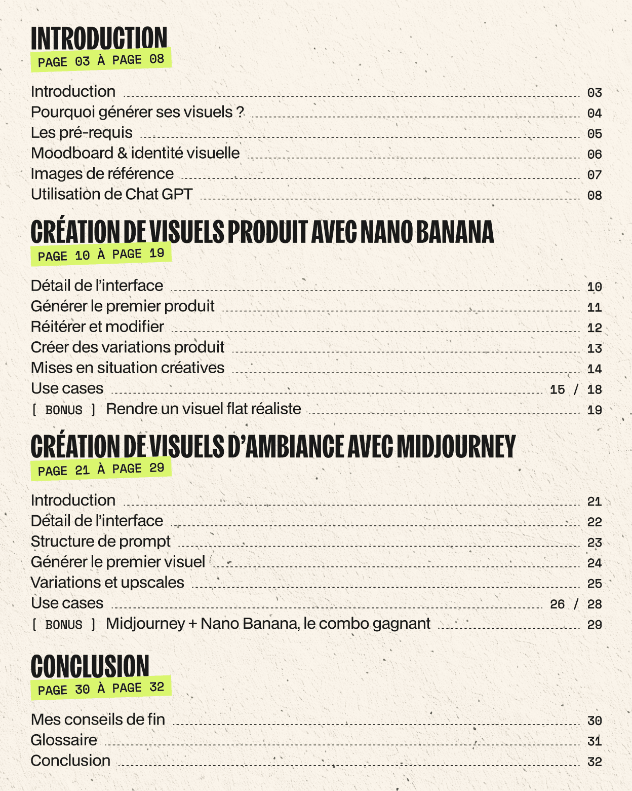 Marre des mockups déjà vus partout et des visuels de banque d’images sans identité ? Dans ce guide (32 pages), je te partage mon process pour créer tes propres visuels d’ambiance et visuels produit avec l’IA, pensés directement pour tes projets de branding. Tu apprendras à structurer ta direction visuelle, écrire des prompts efficaces et générer des visuels cohérents, réalistes et différenciants avec Midjourney et Nano Banana.